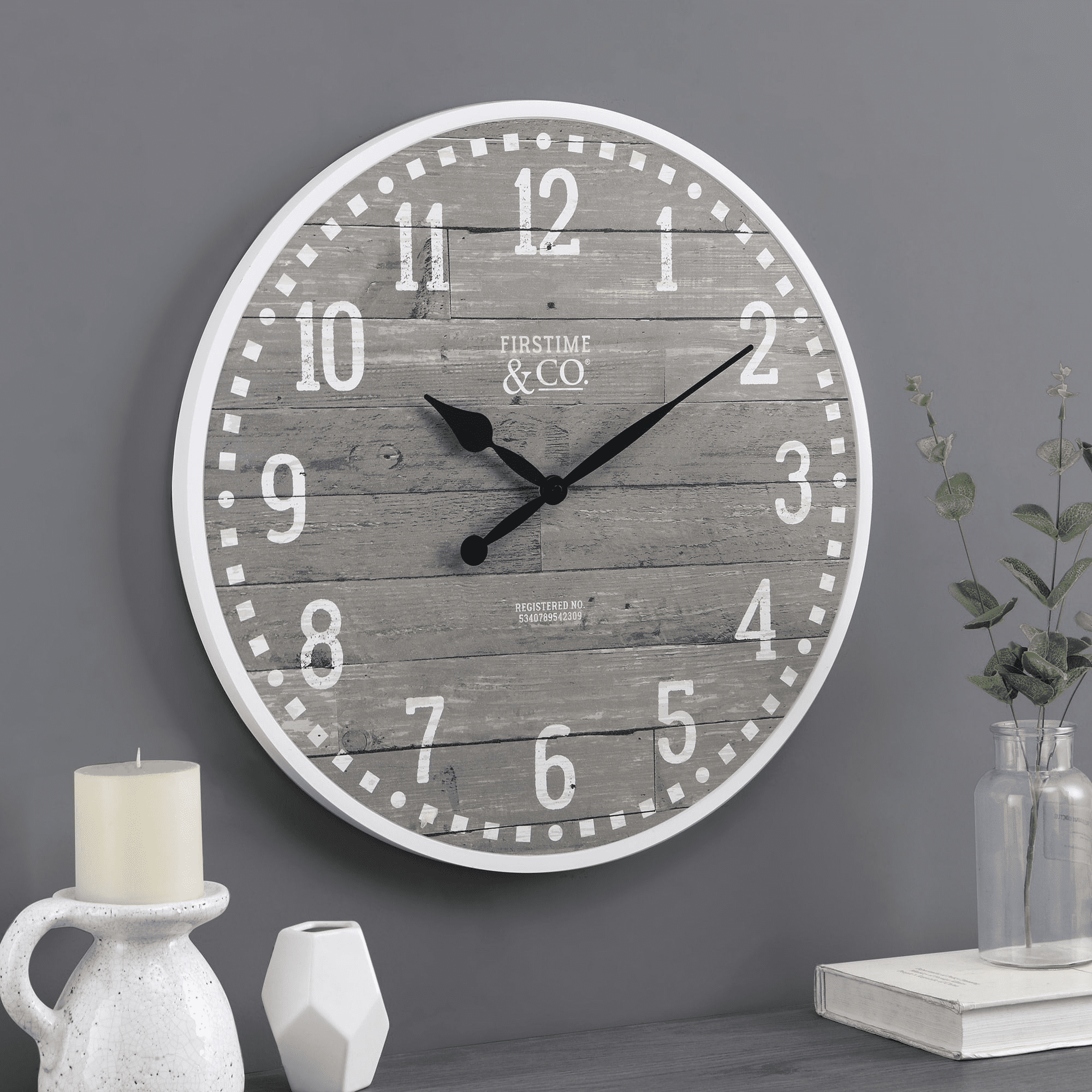 Nothing ties a room together better than a great clock, and the one you choose to place in your home should reflect your personality and style. We hear you. Bring a modern farmhouse look to your home with our firstime & co.® arlo gray farmhouse wall clock. Crafted from plastic, the distressed light gray faux planked wood design and bold, industrial numerals will add a touch of rustic charm to any room. Its oversized 20' diameter is sure to fill your wall with rustic charm. Finding the right clock to suit your style has never been easier thanks to our wide range of firstime & co.® timekeeping solutions.