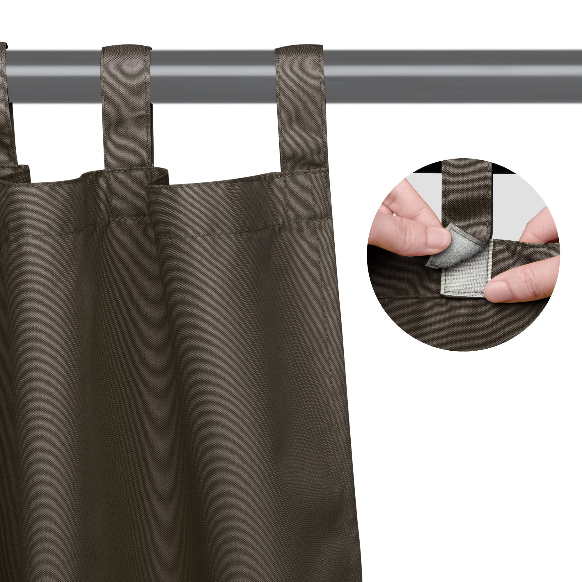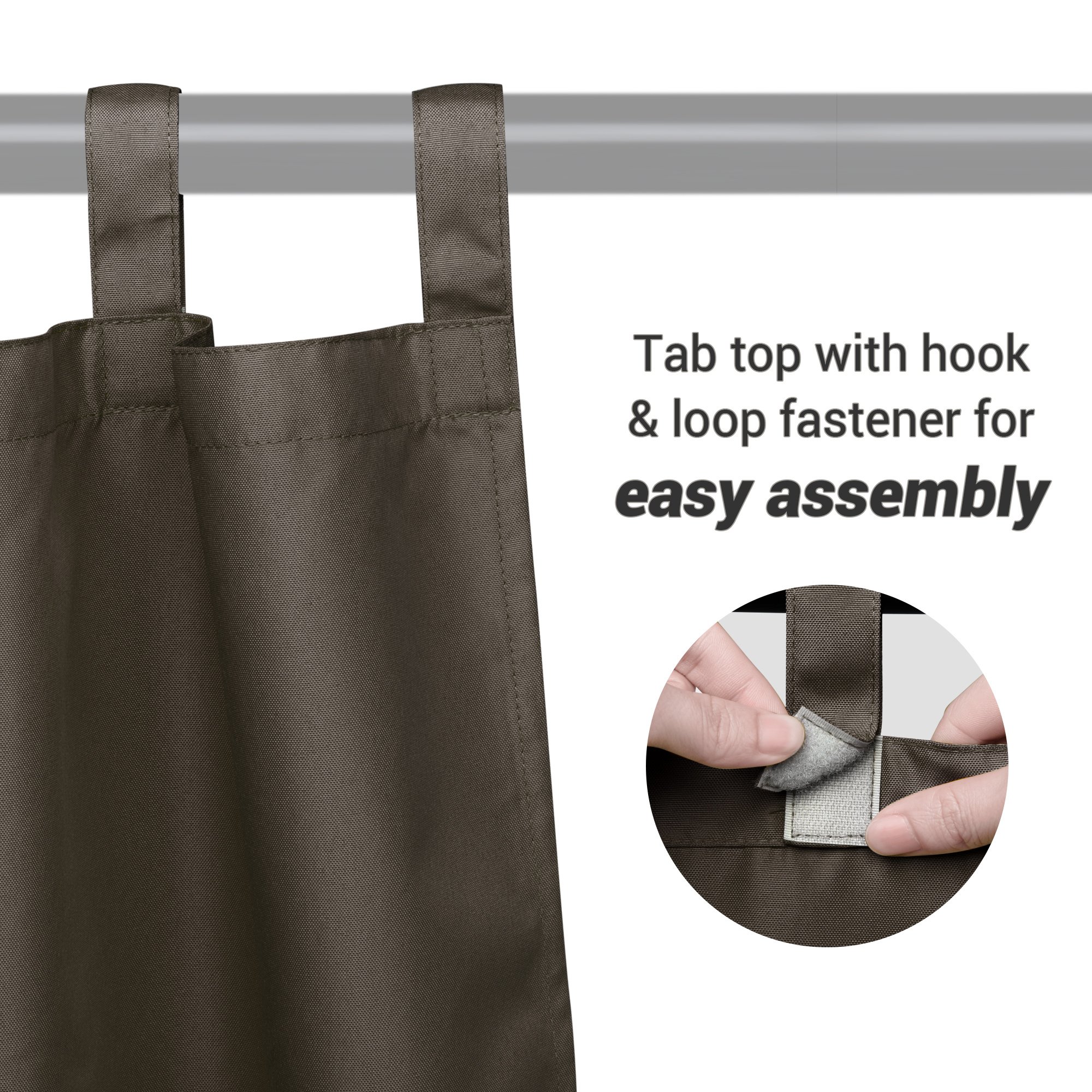 - Hook & Loop Fastener for Easy Installing - 1 Piece 54"x120" Outdoor Curtain Panel; tab top with hook & loop fastener; much easier for attaching to the rod; 4" long tab top perfectly fits curtain rod with diameter up to 2"